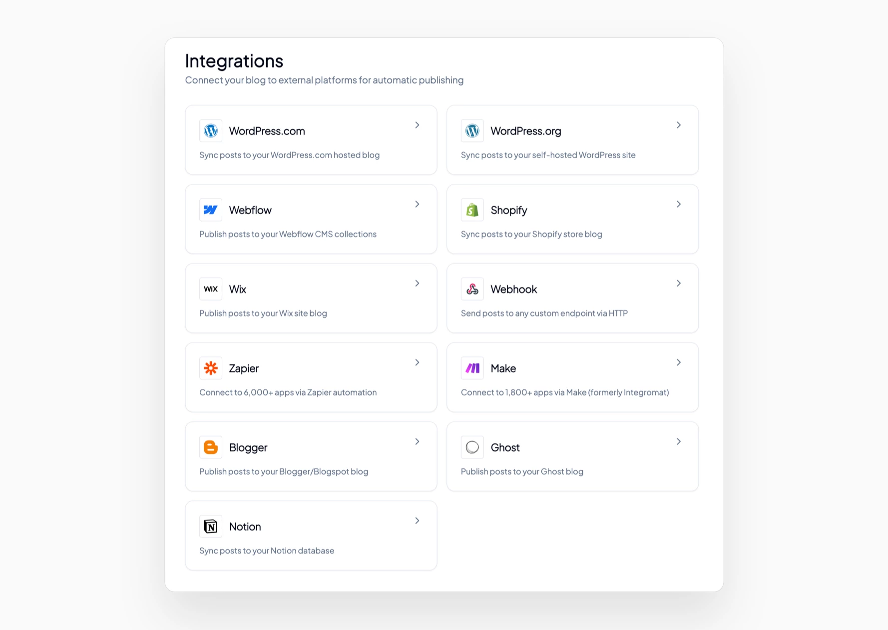 There are a few ways to connect systems when you publish blog posts to multiple platforms automatically: direct platform APIs, RSS feeds that trigger actions, or automation tools like Zapier/Make acting as glue. Blogie fits cleanly into all of these styles depending on what you’re connecting and how customized you want each destination to be.