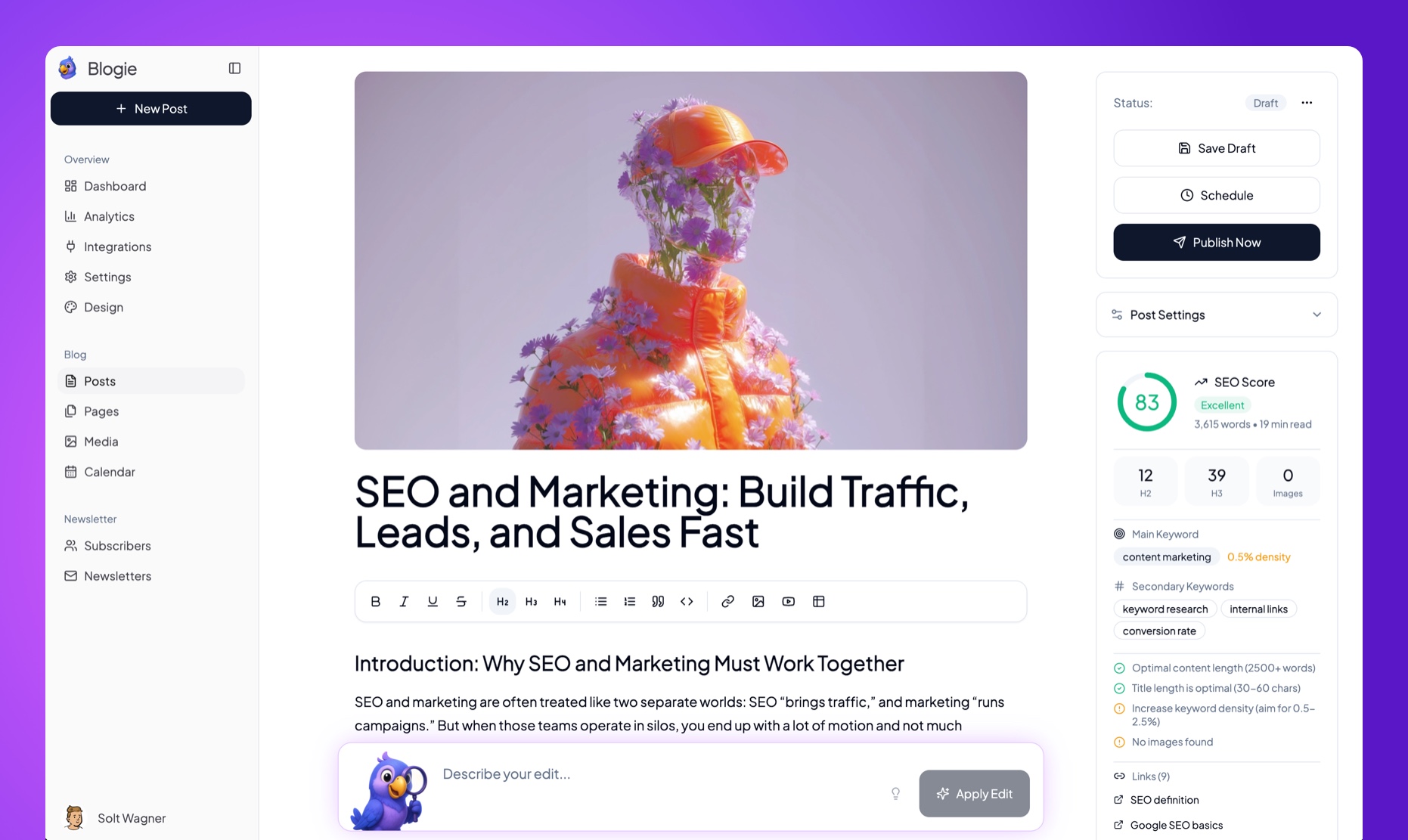 The tradeoff is that you’ll likely need a more deliberate SEO workflow around it. Some people solve that by pairing a creative draft process with a publishing platform (again, something like blogie.ai) that helps you keep posts clean, organized, and consistent once the creative work is done.