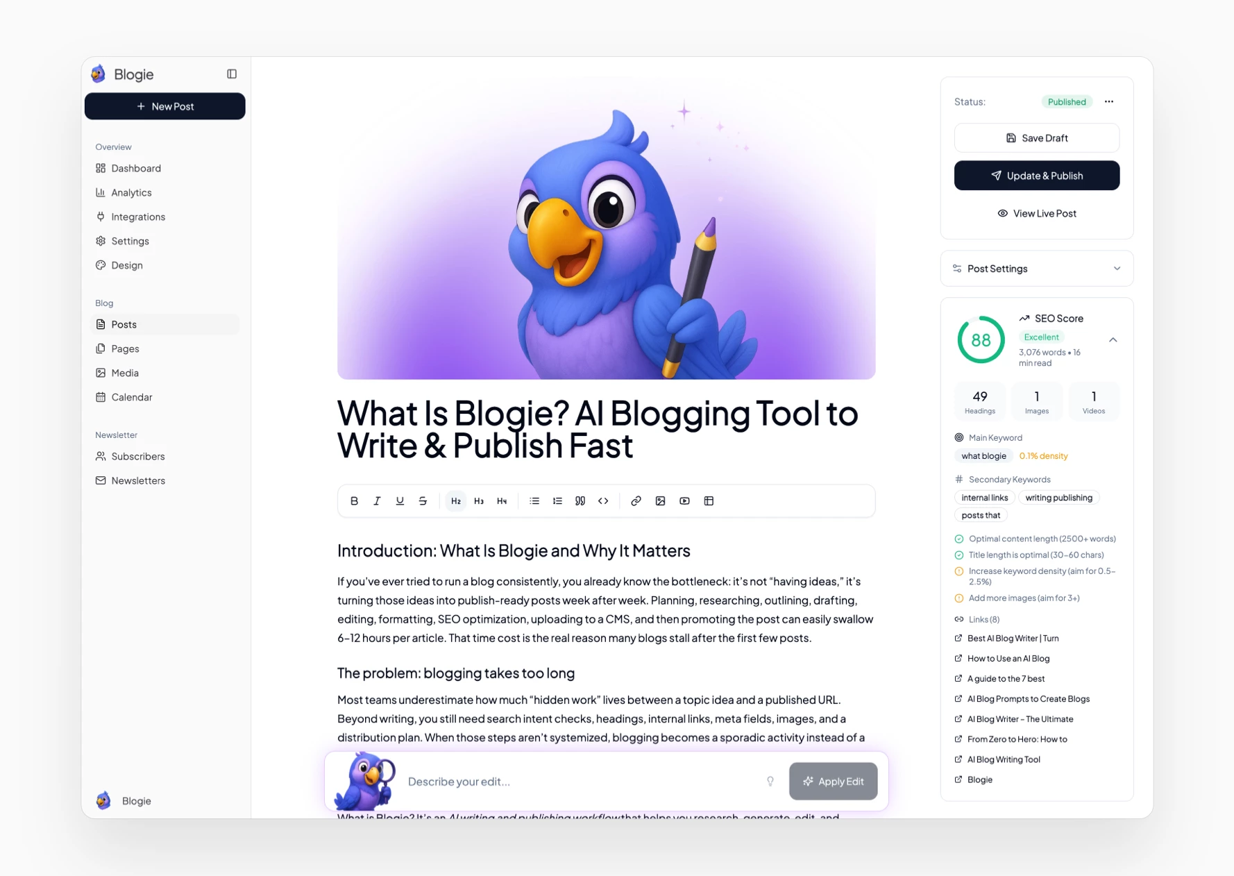 Blogie-style automated blogging works best when the workflow feels like a conversation, not a complicated configuration. You describe what you want in plain language, the system proposes research-backed structure and keywords, and you approve or adjust before drafting. That approach keeps speed high without sacrificing your control over positioning and accuracy.