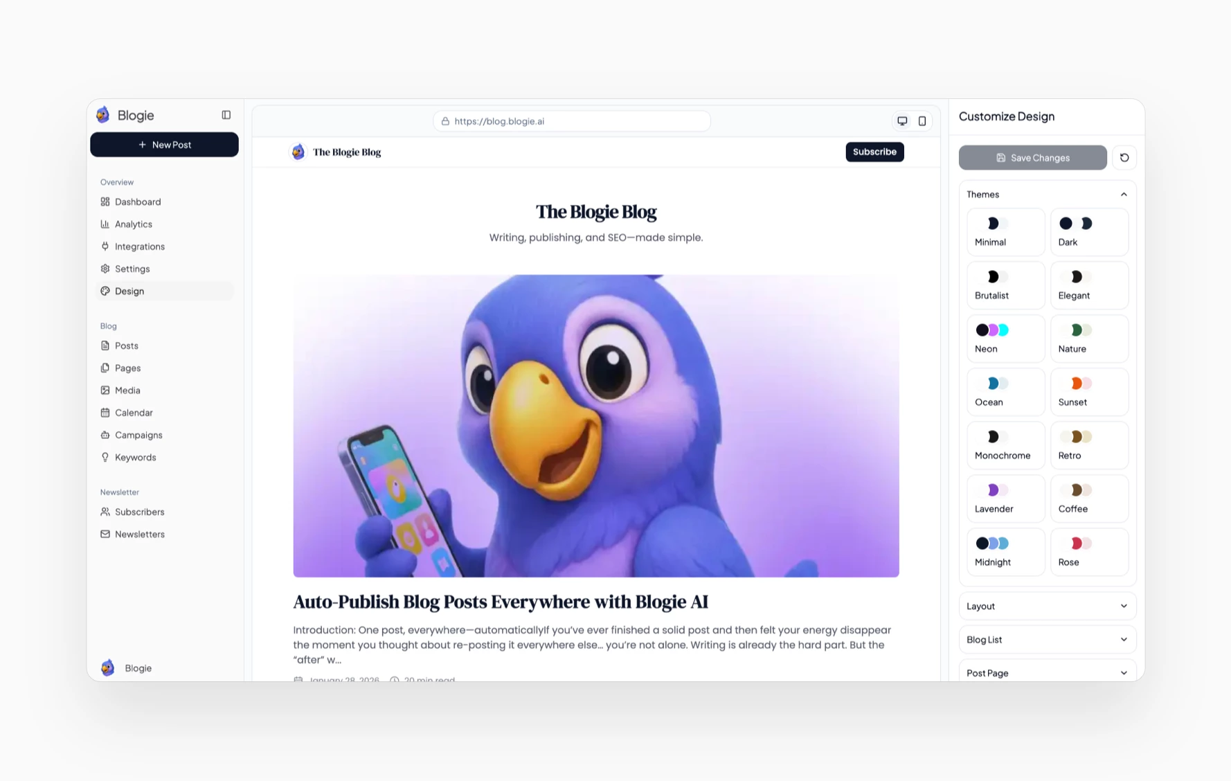 Blogie works like an AI blog generator, but the key difference is that it’s not “generate a blob of text and good luck.” You describe what you want to write, and the platform helps with keywords, competitor context, and structure—then you refine in a clean editor and publish from the same place.
